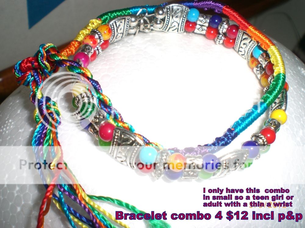 So you can see what they might look like, here are 5 bracelet combo examples showing the rainbow friendship band which I include for free. The price written on the photo includes the free friendship band. Use the email contact form in the right hand column to contact me but since it often fails to work please use clissat@gmail.com & I prefer paypal but can send you bank account details for a direct deposit.